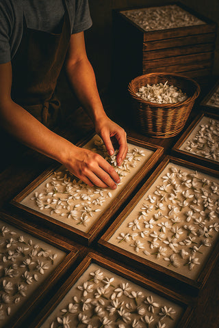Florals or other aromatics are gently laid with precision on to our wax, with blossoms rotated every 48 hours until the fragrance is imbued deeply within the wax.